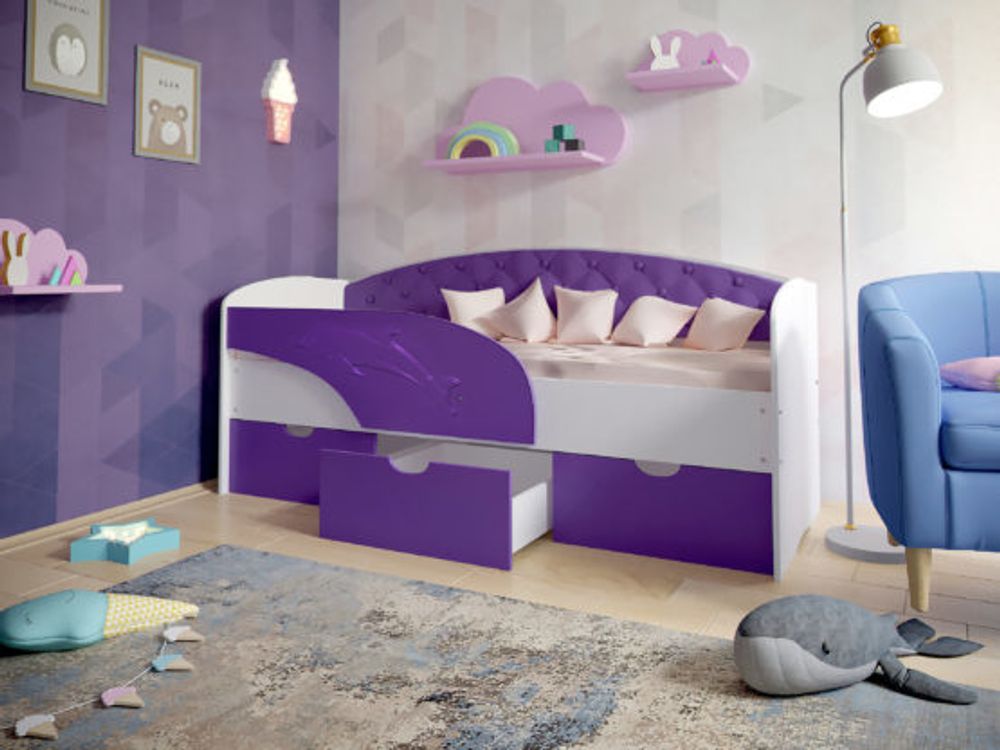 Детская кровать с декоративным бортиком с объемным изображением дельфина, мягкой спинкой, — а так же тремя вместительными выдвижными ящиками.