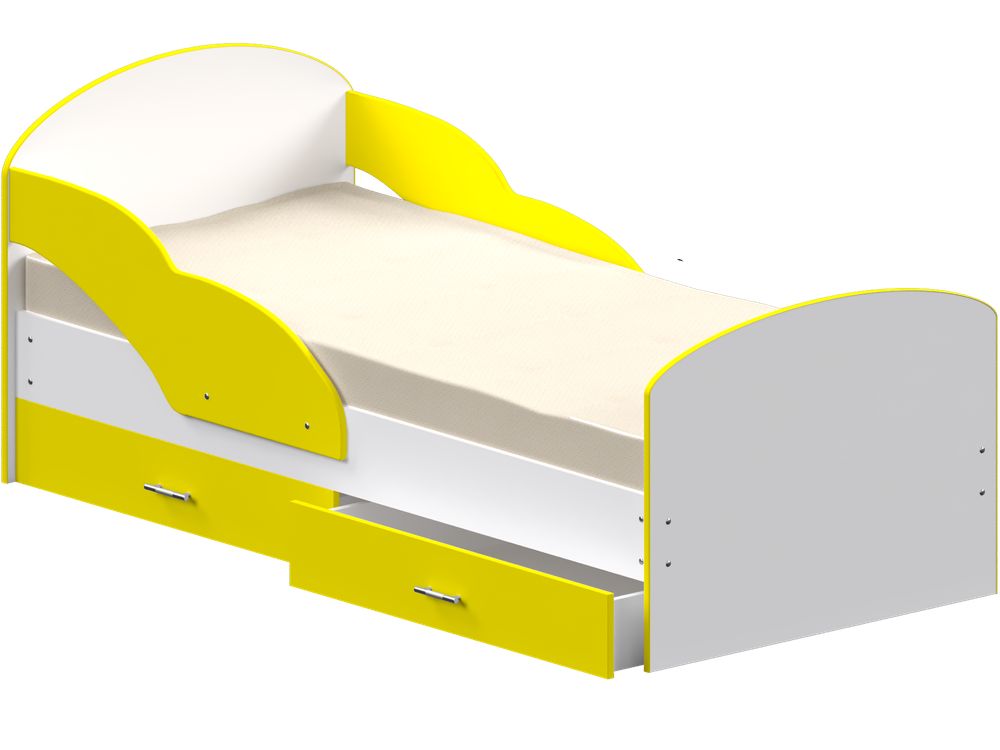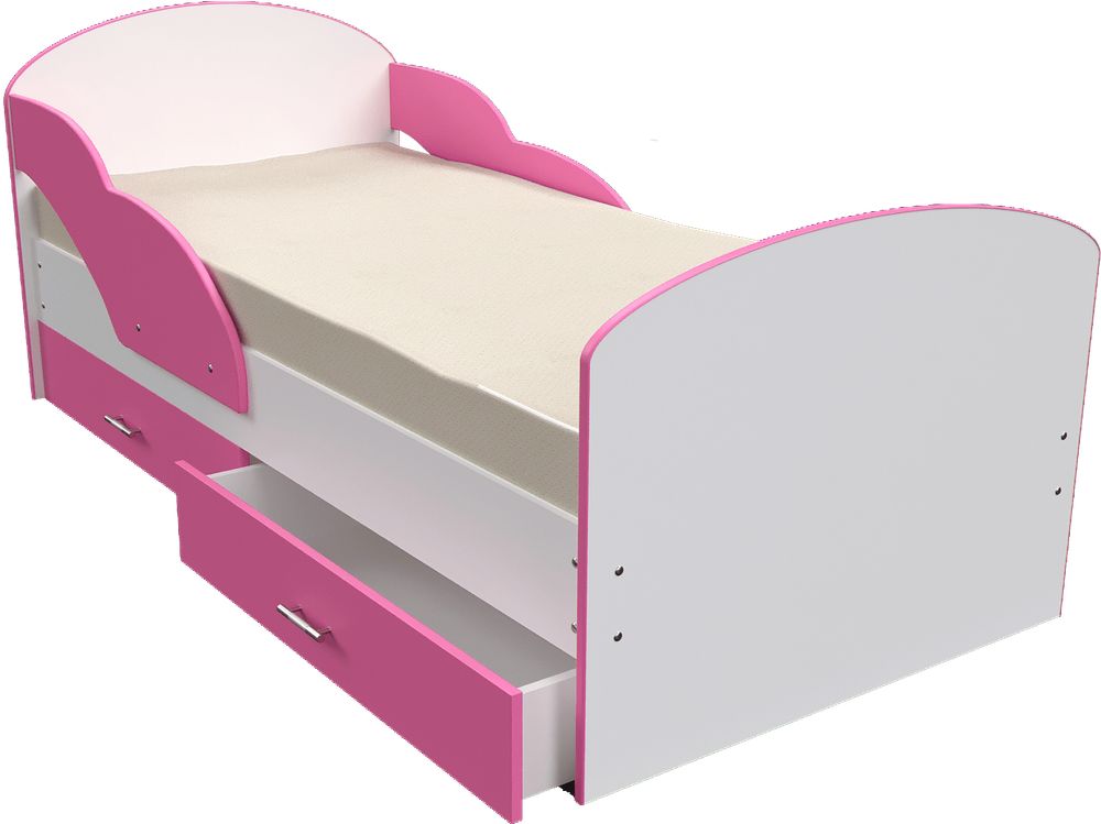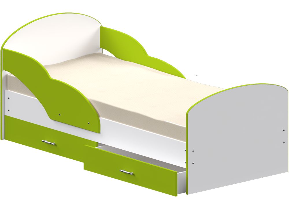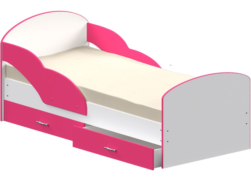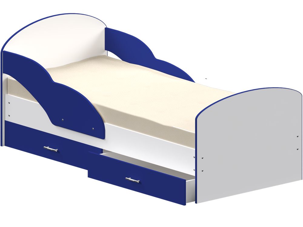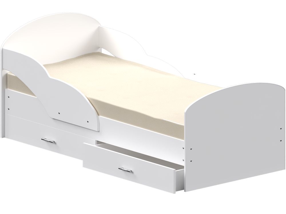 Детская кровать с двумя просторными выдвижными ящиками и бортиками с двух сторон.